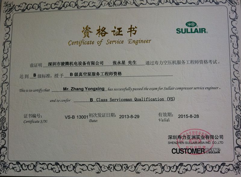 • 張永星獲得B級螺桿式真空泵服務工程師資格