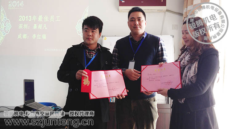 值得一提的是,經過大家一致協商,銷售部的暴超凡和成都的李紅瑞,從馬經理手里捧得了“2013最佳員工”的榮譽證書;而售后部的張永星則幸運的抽中了IPAD大獎。